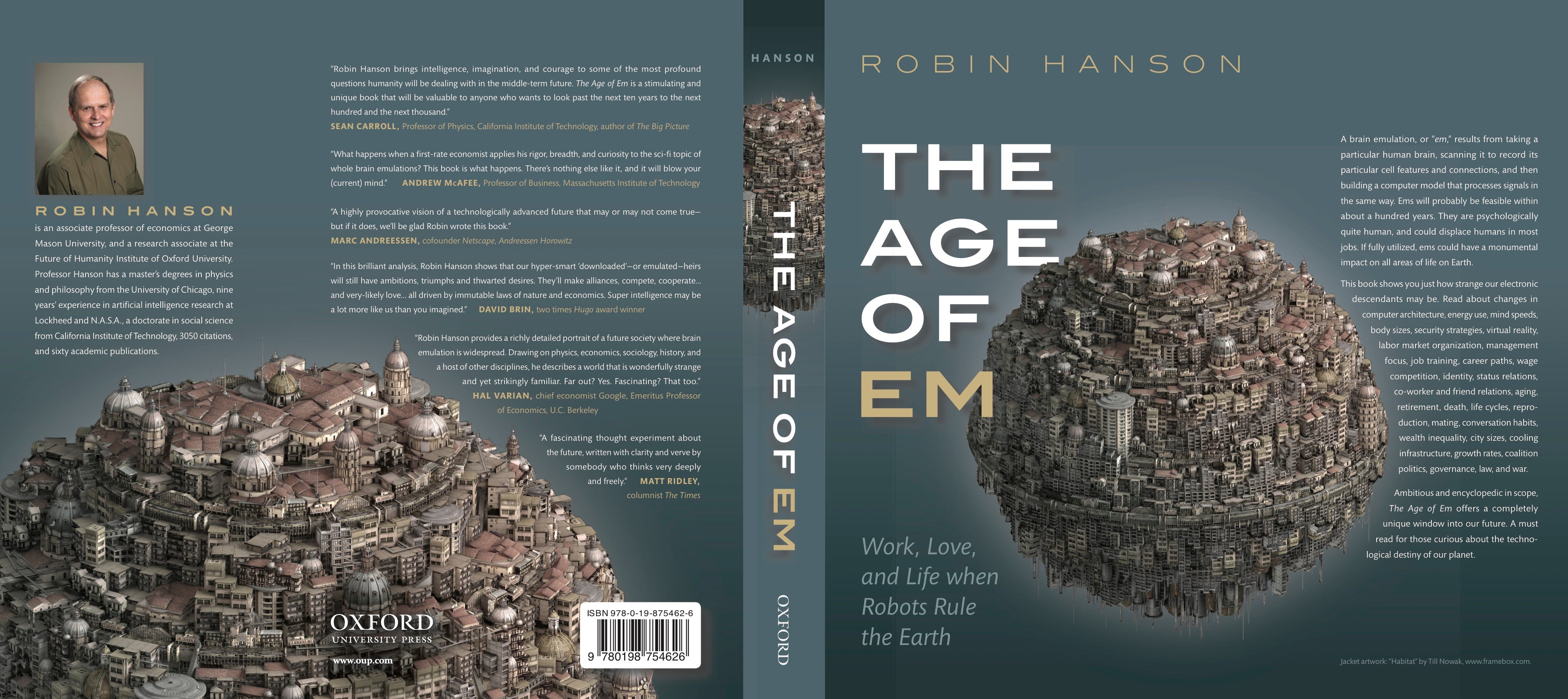 My first book, The Age of Em: Work, Love, and Life When Robots Rule the Earth, is moving along toward its June 1 publication date (in UK, a few weeks later in US). A full book jacket is now available: