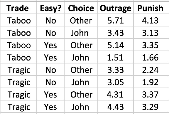 Finally, Robert was said to have chosen to save Johnny, or to have chosen otherwise. Subjects were asked to rate Robert’s decision and describe their feelings about it in 8 ways. They were also asked to make 3 decisions on actions regarding Robert, including dismiss from job, punish, and end friendship. Using factor analysis all these responses were combined into an outrage factor, mainly weighted on 6 of the ratings and feelings, and a punish factor, mainly weighted on the 3 actions. These factors were on a 1-7 point scale. Here are the average factor values for the eight possible scenarios: