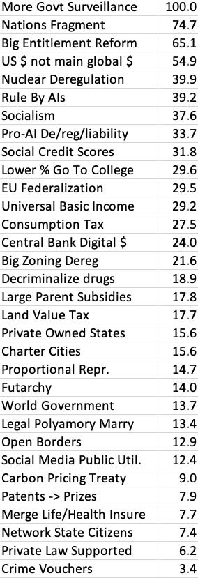 The last row gives the estimated rank of the next period (2025-2075) among the prior six, and this poll estimates a 56% chance that this next period will be above rank 2. So LLMs and polls agree to expect a lot more institution/policy change in the West in the next fifty years.