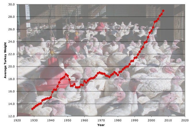 Anderson, who has bred the birds for 26 years, said the key technical advance was artificial insemination, which came into widespread use in the 1960s, right around the time that turkey size starts to skyrocket…