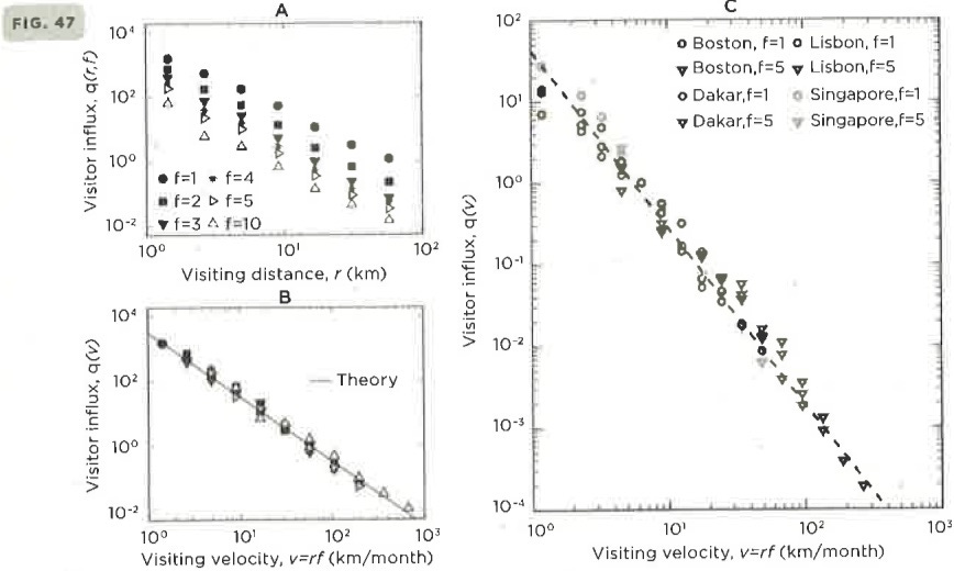 An extremely simple but very powerful mathematical result for the movement of people in cities. .. Consider any location in a city. .. predicts how many people visit this location from any distance away and how often they do it. .. It states that the number of visitors should scale inversely as the square of both the distance traveled and the frequency of visitation. ..