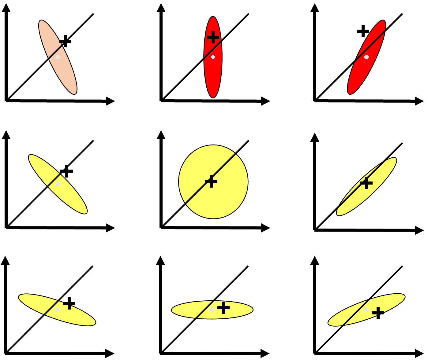 The two dimensions here are of the value of a company’s stock if the CEO is dumped, and if the CEO is kept. Assume that market speculators know only that the truth is uniformly distributed within the oval shown, but the actual decision to dump or keep will be made according to the actual point in this space. Risk-neutral speculators should then estimate the value the stock conditional on dumping by averaging the x-axis value over the yellow region, and also estimate the value of the stock conditional on keeping by averaging the y-axis value over the red region.