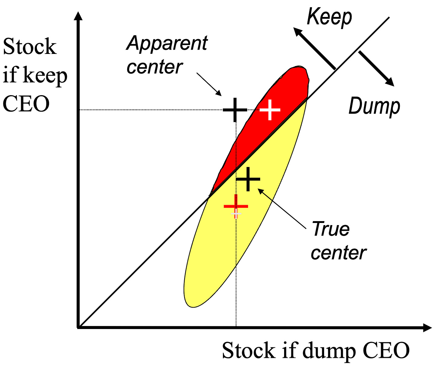 Combining these (x,y) values gives an “apparent center” point, while the “true center” of the oval gives the speculators best info. According to the true center, the CEO should be dumped, but according to the apparent center, the CEO should be kept. Thus a decisions selection bias here distorts the market advice, making it seem like the CEO should be kept, when they should be dumped.