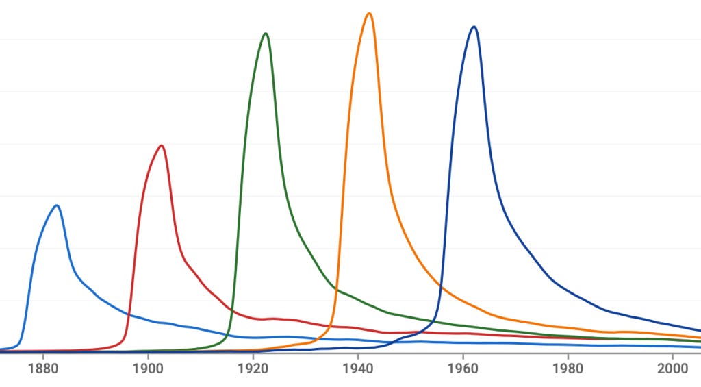 However, I will now show that this argument collapses if we allow the inclination to simulate ancestors to depend on the time duration that has elapsed between those ancestors and the descendants who might simulate them. My main claim is that our interest in the past generally seems to fall away with time faster than the rate at which the population grows with time. For example, while over the last century world population has doubled roughly every 40 to 60 years, this graph shows much faster declines in how often books mention of each of these specific past years: 1880, 1900, 1920, 1940, 1960.