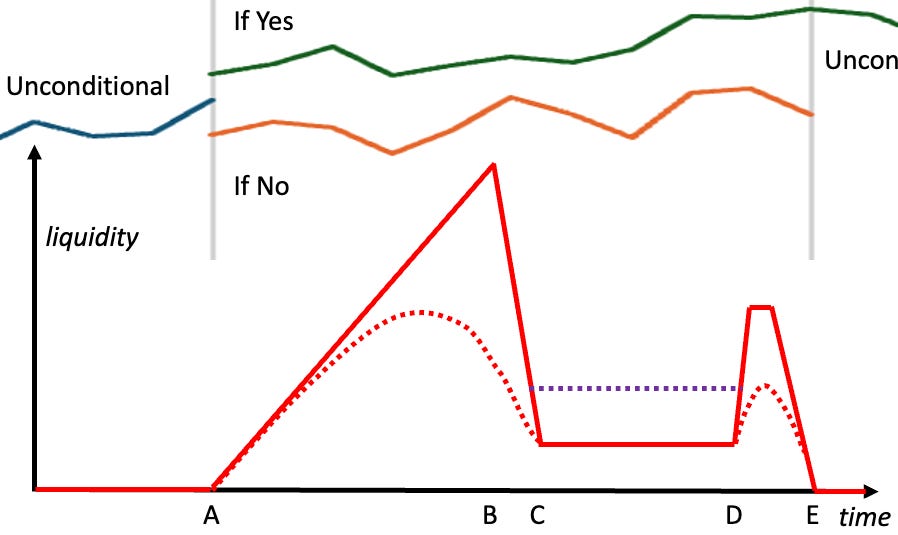 Having a short observation period C to D, and a much higher subsidized liquidity both before and after the observation period, tempts informed traders away from the observation period, This difference needs to be big enough to counter the liquidity added by manipulators, shown in a purple dotted line. The liquidity should be higher before than after the observation period to make the decision as informed as possible. The higher liquidity in the period D to E before the conditional markets end also makes that a good time for traders to coordinate to exit these markets together if there are not thick unconditional market after E.