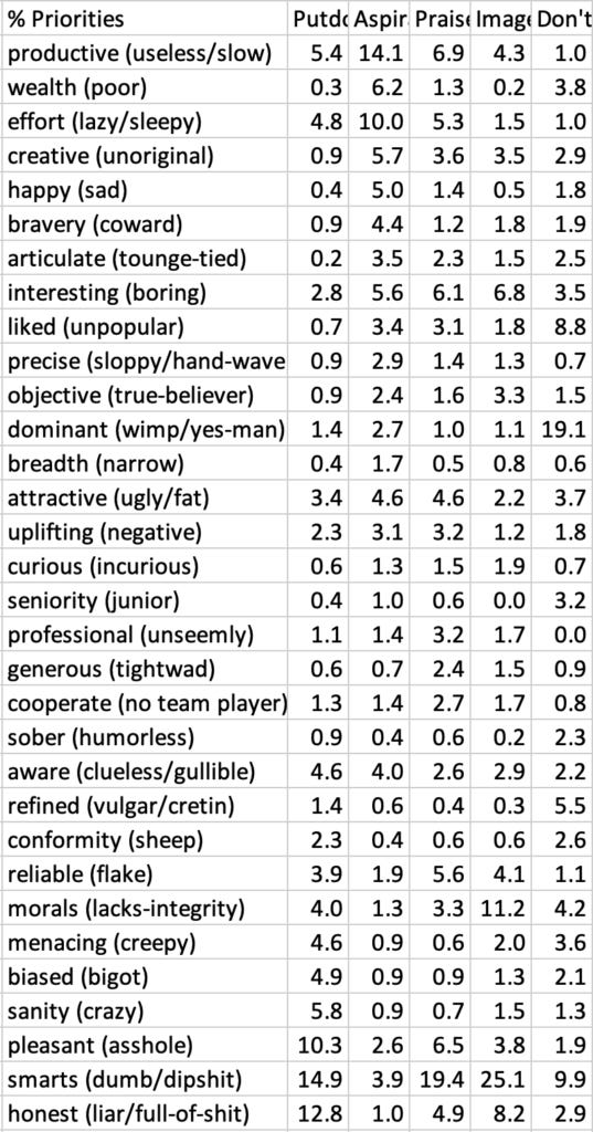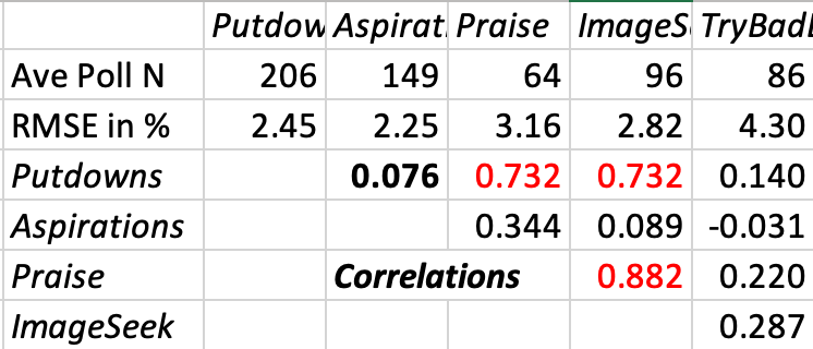It's a pity that the TryLookBad was basically useless as an instrument- I think that it might have had some bearing on "honesty" as a variable- it's an extremely common putdown, extremely status-impacting, and it's something that (I think) myself and a lot of people struggle with and would like to improve in ourselves- but admitting so seems very low-status, since it means admitting you aren't perfectly honest already!