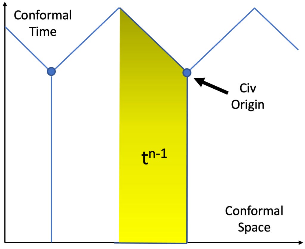 Assume that potential GC origins are uniformly distributed in space. If we integrate the probability density tn-1 over the yellow region, and then renormalize, that renormalization in effect sets the value of the overall filter strength, relative to the origin time of that one civ in the diagram.
