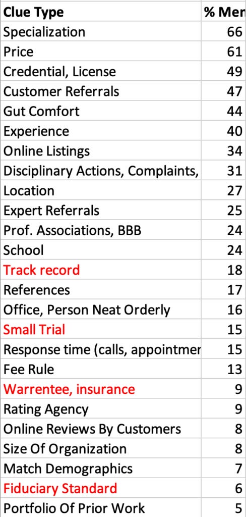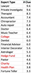 Looking at these tables, I hypothesized that guides might prefer to mention types of clues that we’d more want to use in making our choices, and that guides might mention more clues for kinds of experts where we worry more about choosing them well. So I’ve done a set of 16 Twitter polls to estimate these things for 16 types of experts and 16 type of clues.