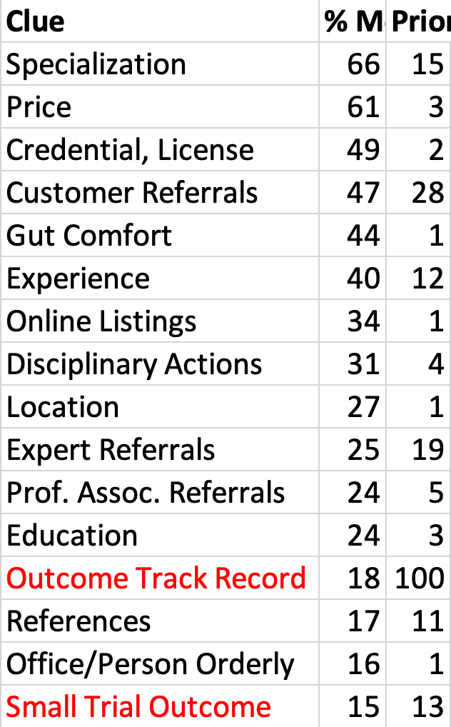 Guides do not often mention outcome-related clues, presumably as few customers attend to them. In general, we can’t tell if a type of expert X is a “quack”, where “better” versions don’t help customers much more with outcomes, by the kind of clues people use to pick X. Maybe most people can’t tell the difference.