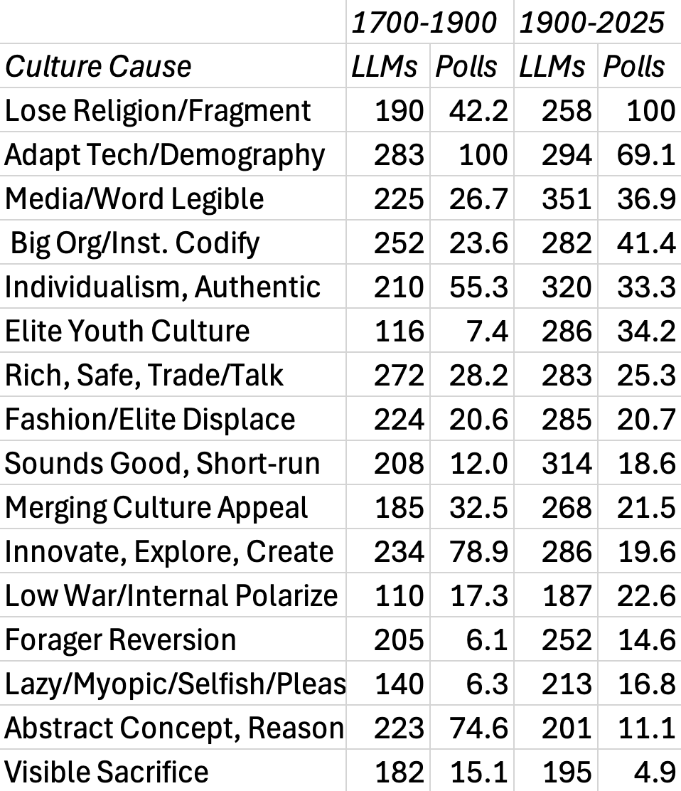 I asked a set of polls, and 3 LLMs (ChatGPT,Claude,Gemini) to rate the relative explanatory power of the following 16 causes of cultural change for the two periods 1700-1900 and 1900-2025. I asked polls re picking 1 of 4 causes, and asked LLMs to think of 50 culture changes in each period, score each cause on a 0-10 scale re each change, and then add up scores per cause. (I also asked Grok, but its rounded sums suggested that it lied about generating detailed scores.)