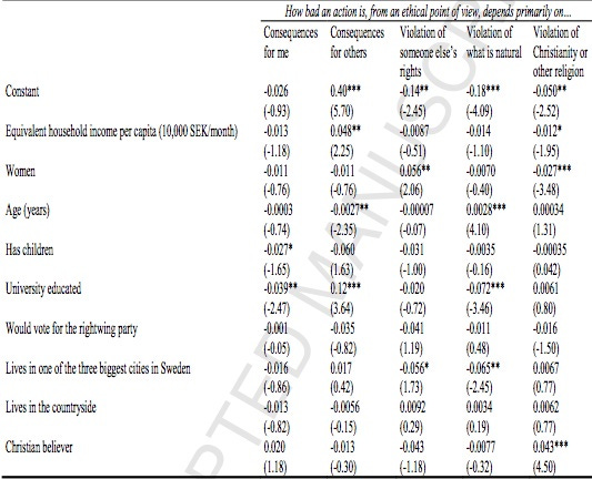 A new survey suggests that most Swedes think an act’s consequences matter most for whether it is ethical, and the young, rich, well-educated think this even more than most. Men are especially unlikely to think that violating someone’s rights matters. Young, well-educated, and big city folks are especially unlikely to think that it matters what is natural.