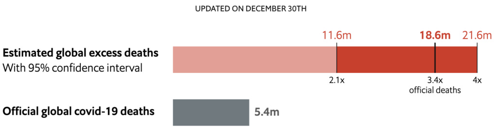 The pandemic’s true death toll; Our daily estimate of excess deaths around the world … Although the official number of deaths caused by covid-19 is now 5.4m, our single best estimate is that the actual toll is 18.6m people. We find that there is a 95% chance that the true value lies between 11.6m and 21.6m additional deaths.