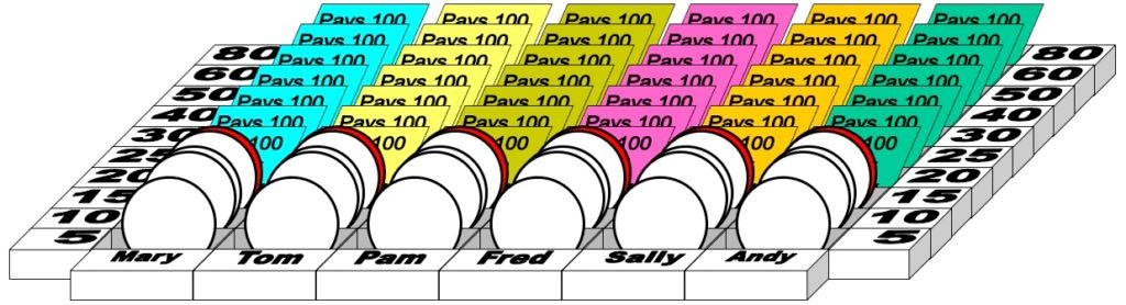Every slot holds either the kind of card for that column, or it holds the amount of chips for that row. The one rule of trading is: for any slot, anyone can swap the right card for the right amount of chips, or can make the opposite swap, depending on what is in the slot at the moment. The swap must be immediate; you can’t put your hand over a slot to reserve it while you get your act together.