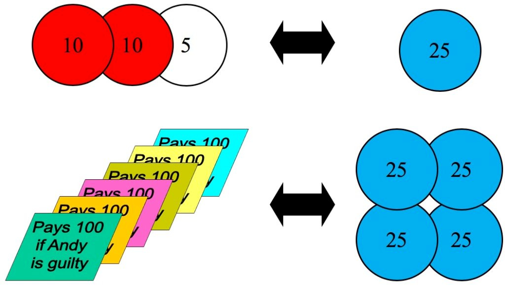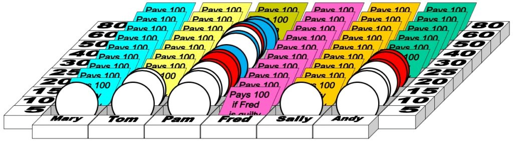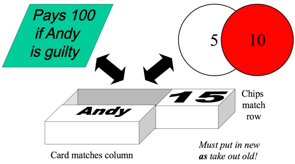 Poker chips of various colors can represent various amounts, like 1, 5, 10, 25, or 100. In addition, you make similar-sized cards that read things like “Pays 100 if Andy is guilty.” There are different cards for different suspects in the murder mystery, each suspect with a different color card. The “bank” allows exchanges like trading two 5 chips for one 10 chip, or trading 100 in chips for a set of all the cards, one for each suspect.