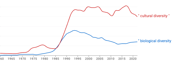 But different kinds rose at different times. First was “ecological diversity”, plausibly from environmentalism: