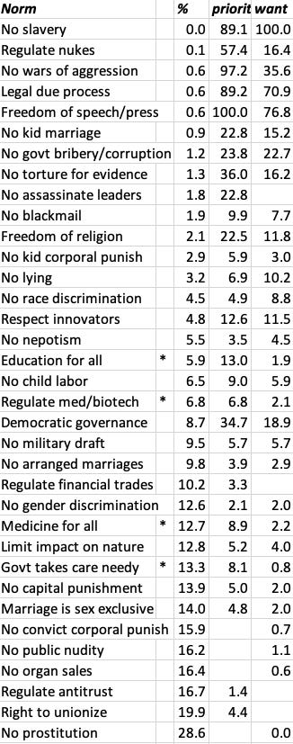 Here % is median lognormal fit re “ideal % of world that does not support this norm”, after reading the prompt “There may be tradeoff between good norms & helping cultural evolution via cultures with deviant norms.”. (76-206 responses per norm.) Rows are sorted by this %. The column priority is relative priority (max 100, min 0) in 4-way comparison polls re for which norms “you want smallest % of world to be in deviant cultures that don’t support that norm”. (2709 total responses) For reference, want is poll priority re norms “you most want your society to support”, The marker * indicates that a norm was worded a bit different in want polls. (4234 total responses.)