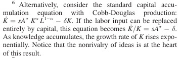 Suppose that over time, it becomes possible to replace more and more of the labor tasks with capital. In this case, the capital share will rise, and since the growth rate of income per person is 1/(1 − capital share ) × growth rate of A, the long-run growth rate will rise as well.6 …