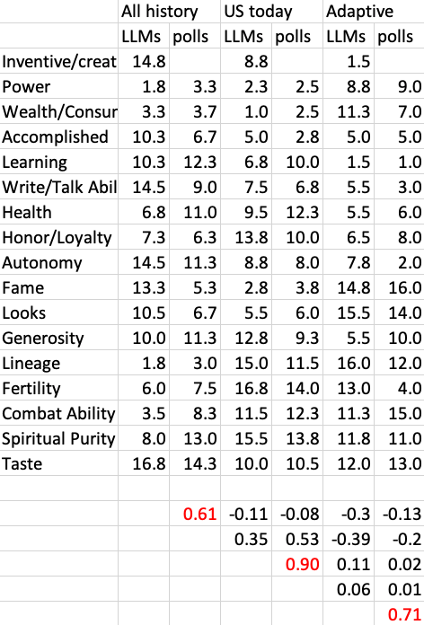 I also asked four LLMs to rank these markers, plus one additional, in terms of all history, US today, and adaptiveness. Here are their averaged results, compared to averaged poll results: