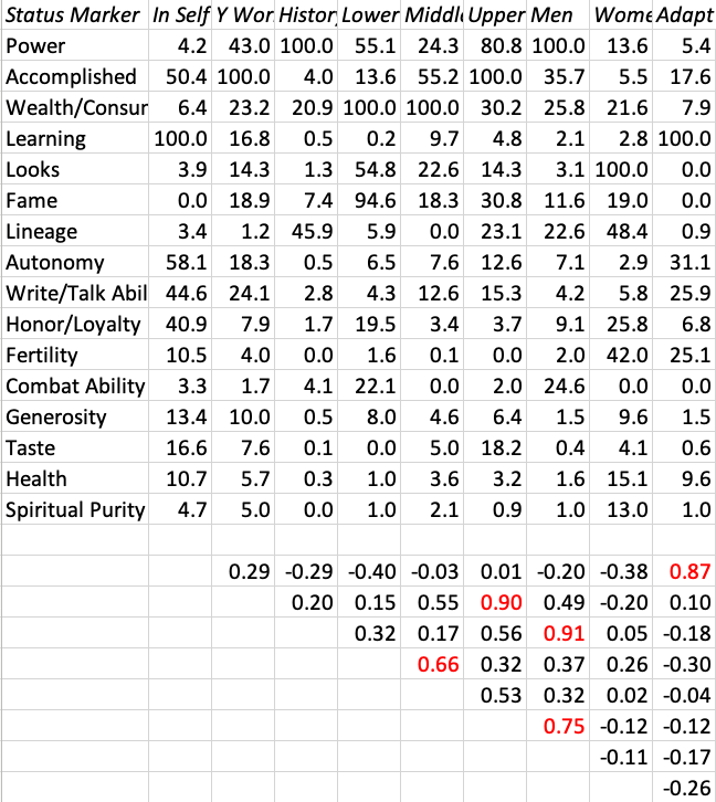 Note that proud of in self and adaptive correlate 0.87, status overall in your world and in the upper class of your world correlate 0.90, and status overall in history and among men in history correlate 0.91. Thus we plausibly like to say that the markers we have are most adaptive, and we are biased to focus on the upper class of our world and on men in history. Note that men in history and upper class today correlate 0.75, both easy to criticize “up” groups.