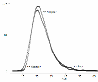 Distribution-sensitive measures of overweight … [show] that the severity of overweight has been higher for the poor than the nonpoor throughout the last 35 years. … The strongest relationship between income and BMI is observed at the tails of the distribution. … For those at the tails of the BMI distribution, increases in income are correlated with healthier BMI values.