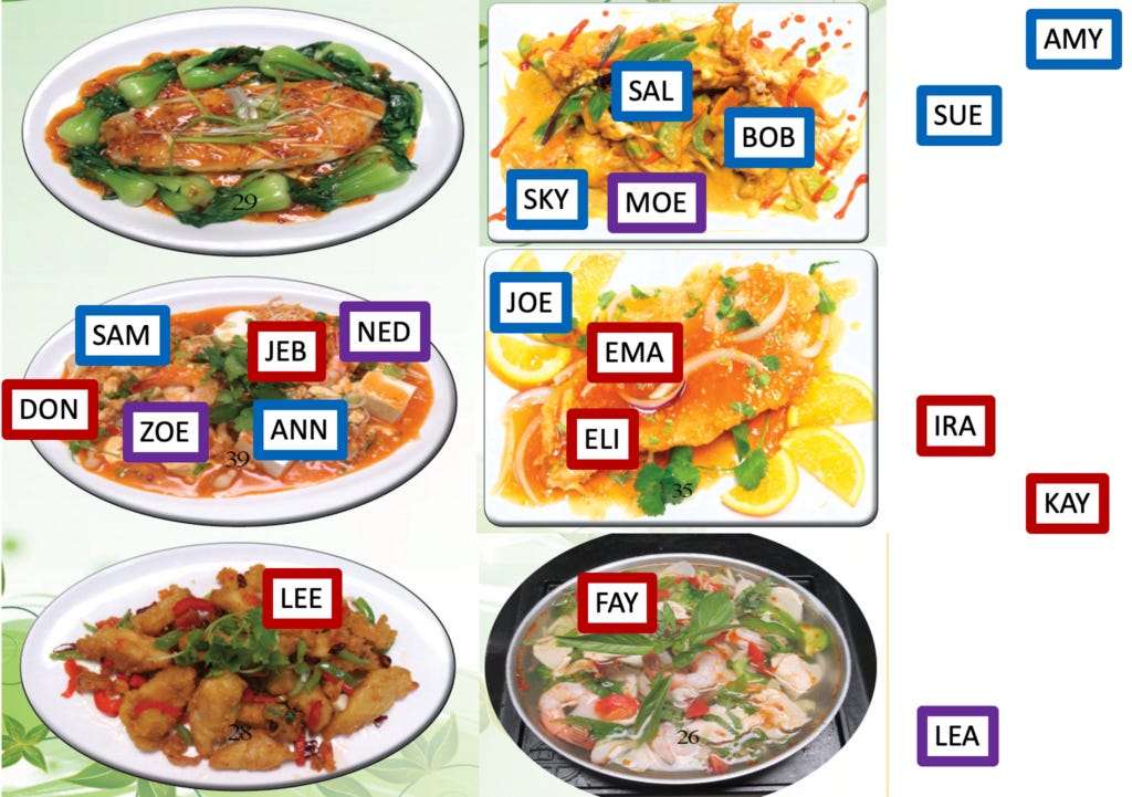 At the deadline, the two menu items with the most pins become the menu specials for that night. Anticipating this, most associates will move their pins to converge on two items, as in this scenario: