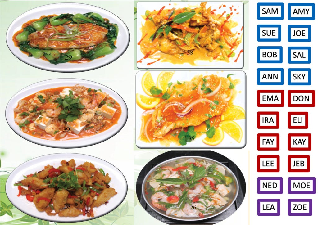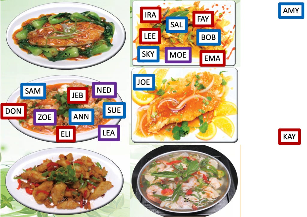 On this board are pictures of menu items that could be specials, and to the side a set of name pins, one for each associate. The pins are color-coded with the kind of associate (cook, server, etc.). At any time before a deadline, each associate can move their own pin to any of the menu items, or move it again to change their mind. This is what the board might look like partway through that process: