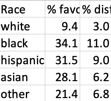Added 16Apr: I checked on the odd race results with a new set of polls, polls that also collect some data on when people disfavor their side of a divide. This time the results made sense in terms of race as an up-down divide:
