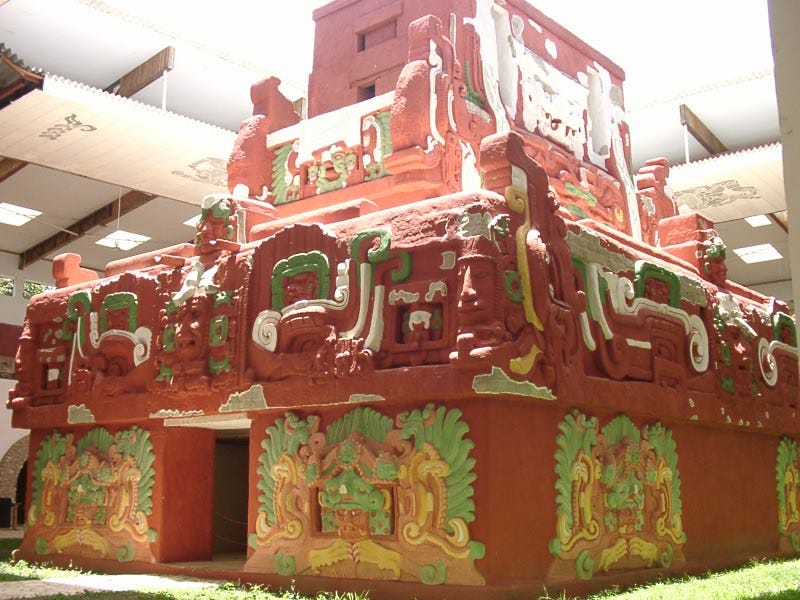 We usually think of very old buildings and statues as plainly colored, with just the color of the stone, but in fact they were usually painted colorfully, as the Greek pictures below show. Mayan temples and gothic churches were also wildly colored. But if so, why don’t we see the remaining buildings, statues, etc. painted like that today, so people can see what they looked like? They are often painted, but with plain stone color paint!
