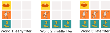 Here are three possible worlds, and within each possible world three different planets are shown on the X axis, while three different times are shown on the Y axis. The three worlds correspond to three different times when the great filter might occur: 1) before any life, 2) before intelligent life, or 3) before space colonization.