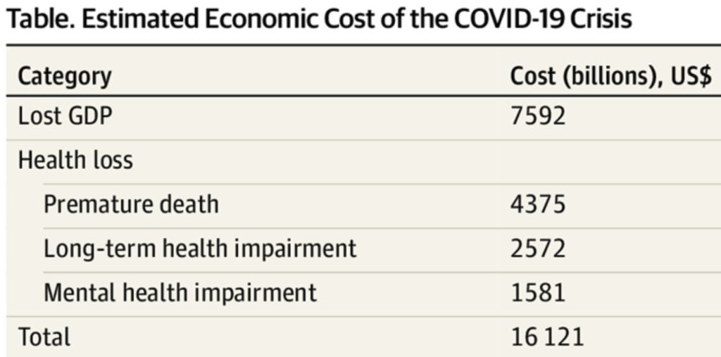In the Oct. 12 JAMA, David Cutler and Lawrence Summers estimate the total costs that the U.S. will suffer from the covid pandemic. Here is their key table: