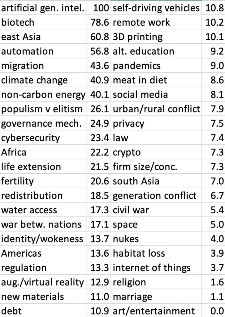 The top 7 areas hold half the total strength, and there’s a big drop to #8. ~20% is in automation, AGI, and self-driving cars.
