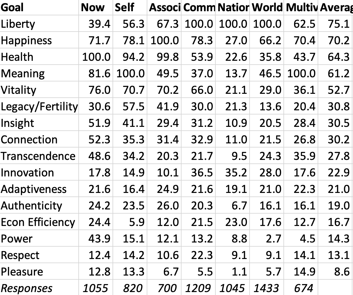 Some polls of mine ranked 16 possible goals re “what you most fundamentally want to get for your self, associates, & community”. From top rank on down, I found: Liberty, Meaning, Health, Happiness, Vitality, Adaptiveness, Insight, Innovation, Econ Efficiency, Legacy/Fertility, Transcendence, Power, Authenticity, Connection, Pleasure, Respect. (I tried a longer list at first, then cut back to these.)