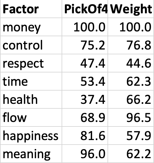 I just did two sets of polls that seems to confirm this. I asked people in two different ways about the importance of eight different features of jobs/careers: money, control, respect, time, health, flow, happiness, and meaning. Here are the weights, relative to money, via asking to choose between four options (N = 376-432), and via (a median lognormal fit to) asking for a weight number (N= 170-218).