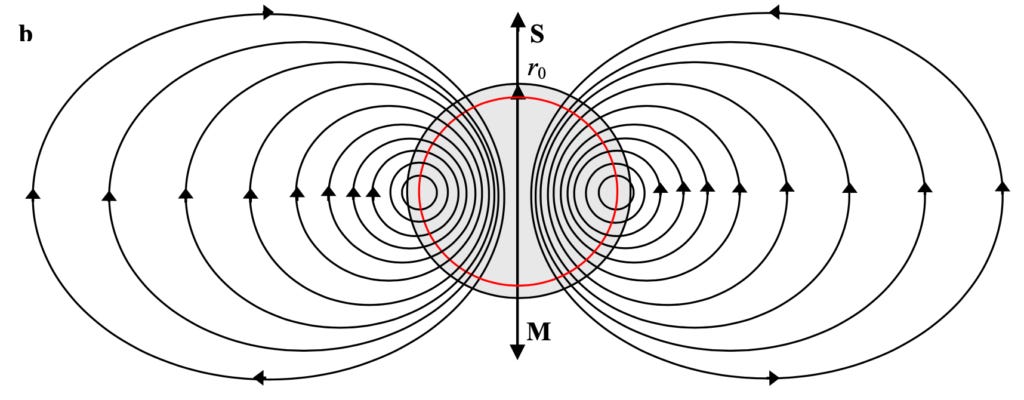 The first (radial balance) equation says that magnetism is only a big effect on star motions in galaxies if vB becomes comparable in magnitude to E, while the second (axial balance) equation says that E and vB are in fact comparable in magnitude! Yes these are talking about different (R vs. Z) components of these vectors, but over the whole galaxy these components are connected in ways that ensure that large values of one component in one place imply large values of the other component in other related places. For example, here is a calculated B field around a spinning uniform mass sphere:
