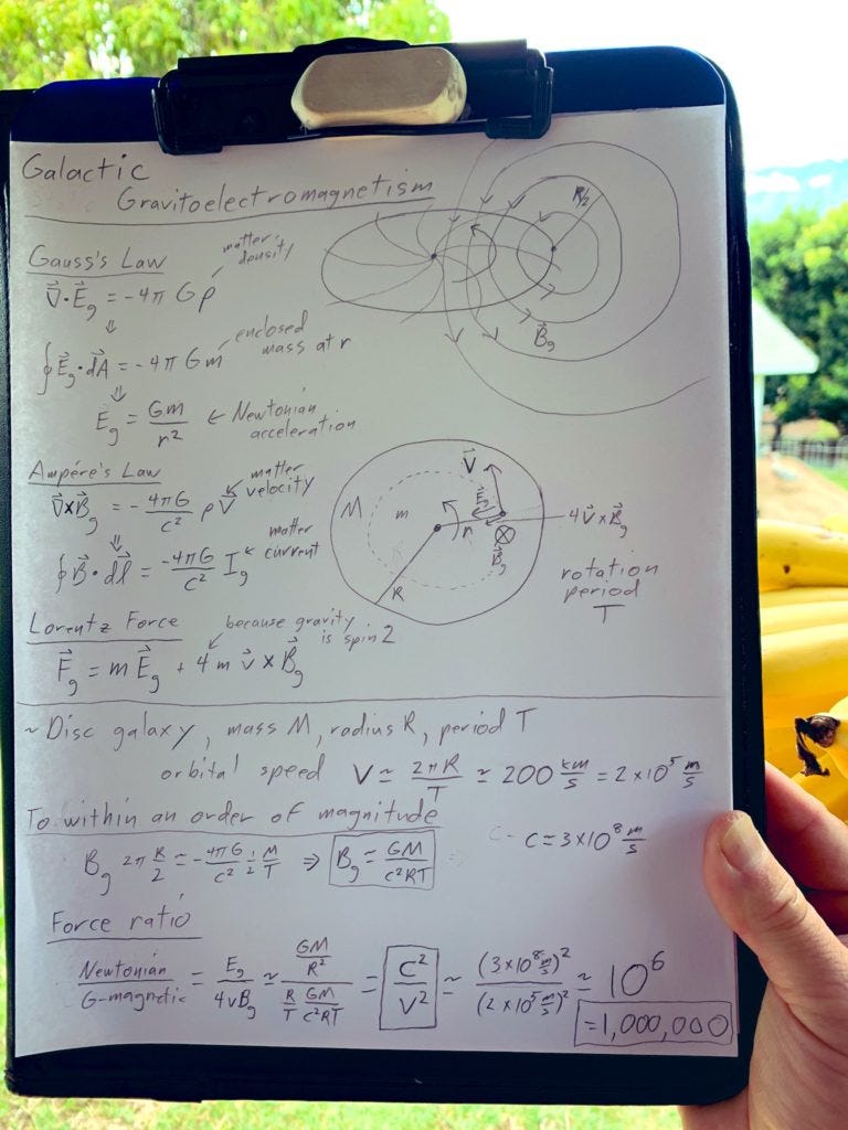 My initial reaction was skeptical snark. Yes, gravity has a magnetism, just as does electricity, and yes magnetism can push on stuff in a way that mimics the effects of dark matter. But I knew that this is an old hope, usually dropped after people do a standard quick calculation and see that its effect looks really weak, given the usual speeds of stars rotating in a galaxy.