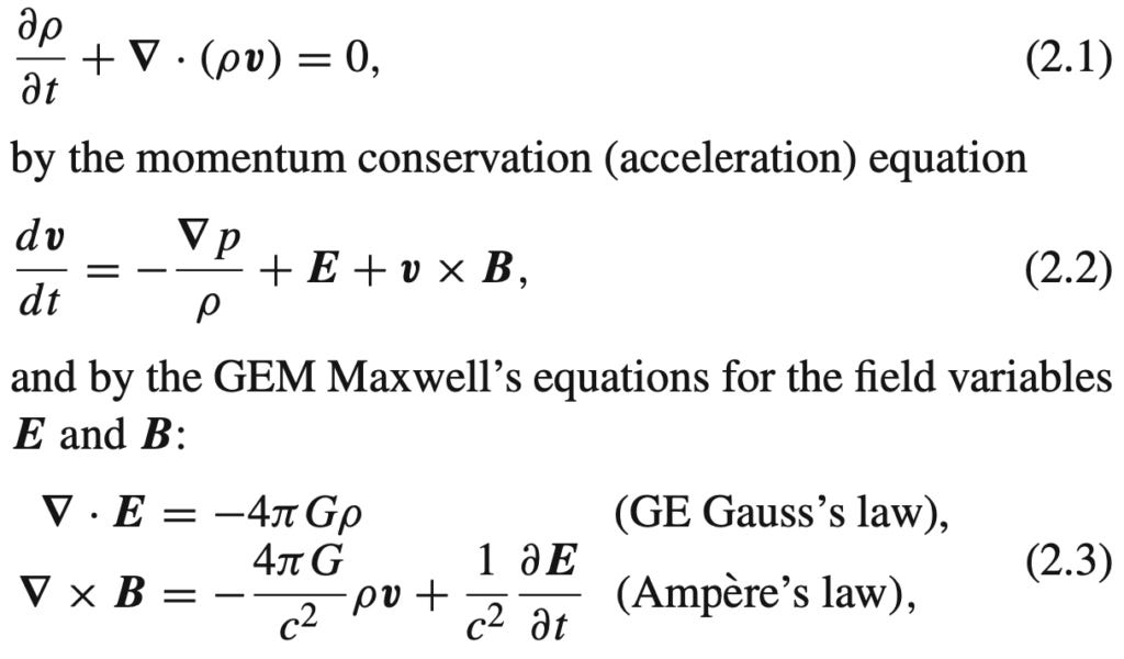As star-star collisions are very rare, Ludwig assumes a time-invariant (i.e., “equilibrium”) rotationally-symmetric system of zero-pressure (p=0) dust that only moves in the azimuthal direction. (That is “around” the galaxy, in a direction perpendicular to the radial and vertical dimensions). This implies that E and B have only radial components ER, BR and vertical components EZ, BZ, and also that: