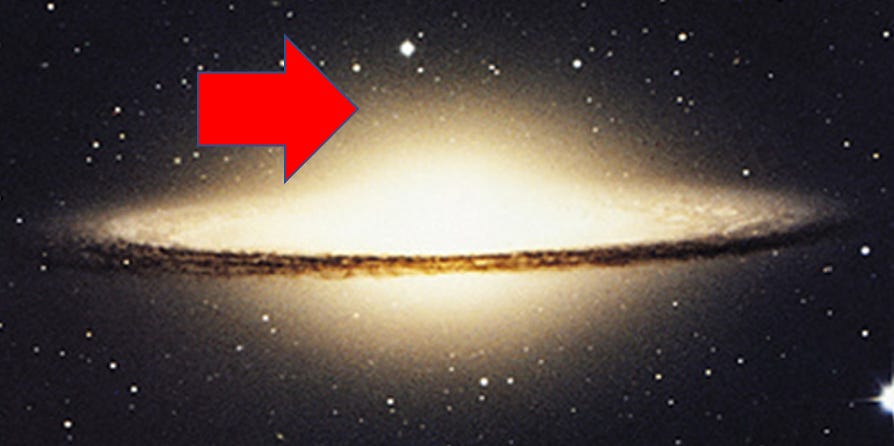 So how could the usual quick calculation go so wrong here? Well, consider a point as indicated by the big red arrow here near the “North Pole” of this galaxy.