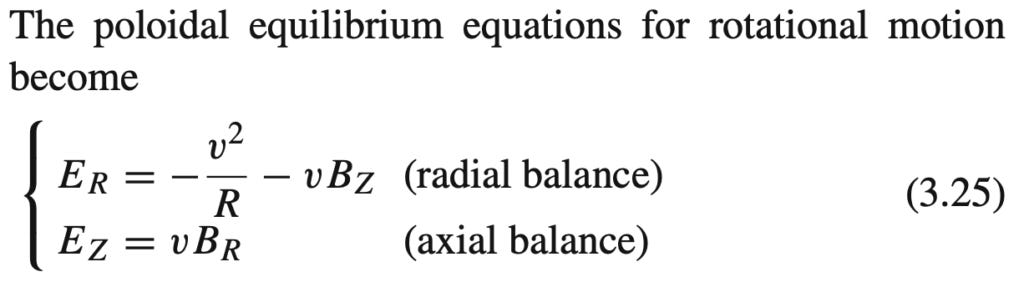 Gravity’s E should be pulling it downward, toward the center, but according to the only-azimuthal motion-assumption it is not falling down. Yet according to Equation 2.2 above, if the pressure is zero then the only other force left to hold it up is v x B. So of course these assumptions must imply a large magnetic field B, with a comparable influence to E.