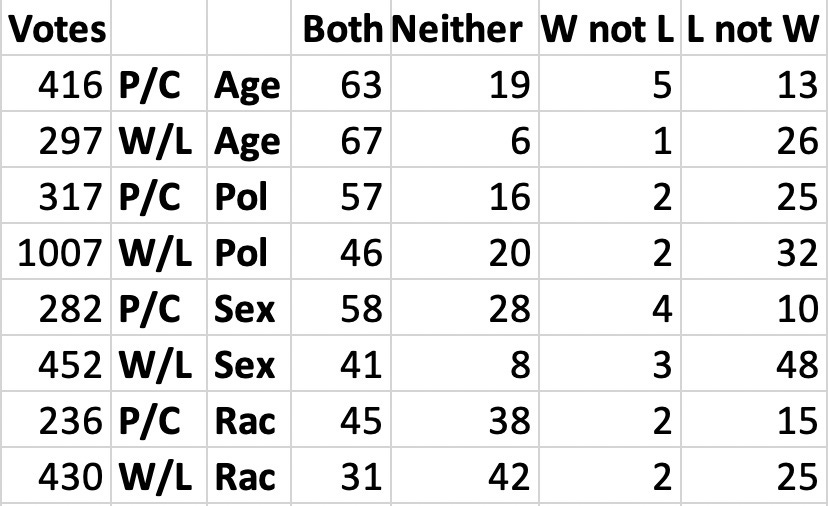 The rest of the questions made one of two changes. One change was to swap the type of choice from work/life to “producer (P) of a good or service to choose its customers (or price), or for a consumer (C) to choose from whom it buys”. The other change was to swap the choice basis from “political views or ideology” to “age”, “sex/gender”, or “race/ethnicity”. Here is the table of answer percentages (and total votes):