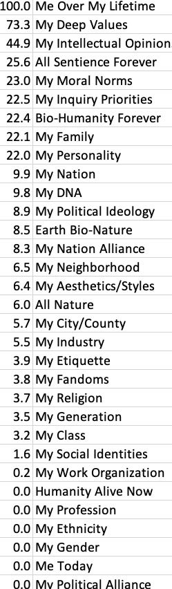 Pondering human evolutionary dynamics, I wondered what people want to pass on to their future. So I collected 32 options and did 24 polls asking “what do you most try to promote/grow with your actions”. From 2932 responses, I got these relative priorities: