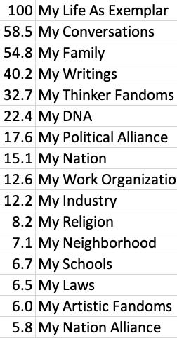 Note: you have to go pretty far down this list to get to items with a plausible story for how the usual ways that people promote such things could have much long term impact. Items like: Family (#8), Nation (#10), DNA (#11), Nation alliance (#14). So I wondered: how do people plan to influence the other items? To learn that, I picked 16 plausible influencers and asked: