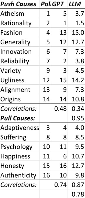 Note that pushes add up to 2.8 times as much total priority as pulls. The following table gives rankings from those polls, from ChatGPT o3, and from an average of six LLMs, and also correlations between these rankings. The top section does all this for push causes, while the bottom does it for pull causes.